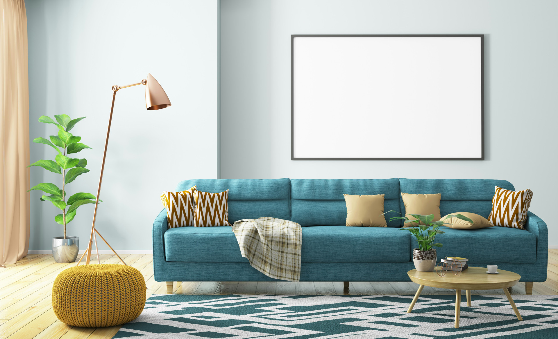 Et stort tæppe under sofaen samler rummet og gør det mere indbydende. Vælg et, der passer i størrelse – det skal helst gå et stykke ind under sofaen, så det visuelt binder møblerne sammen. Til fest kan du lægge et ekstra lag med et mindre tæppe i en kontrastfarve for at skabe et mere markant udtryk.